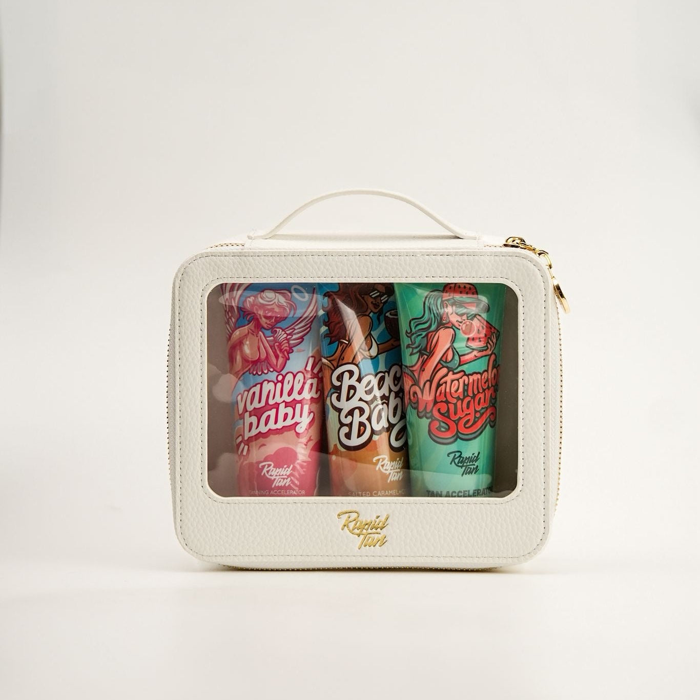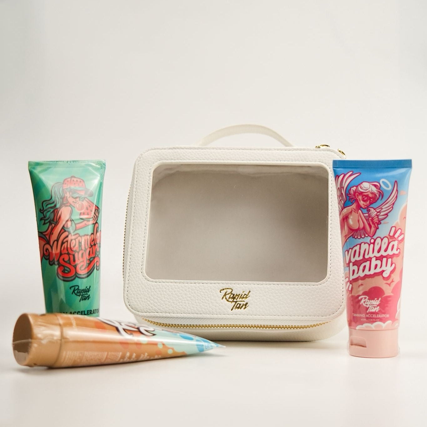 Inside, you’ll find our three best-selling accelerators: Watermelon Sugar, Vanilla Baby, and Beach Baby — each crafted to deliver rapid, radiant results while leaving your skin silky-soft and sun-drenched. Each bottle is a 100ml travel-friendly size, perfectly designed for your carry-on so you can glow effortlessly on-the-go and breeze through airport security in style.